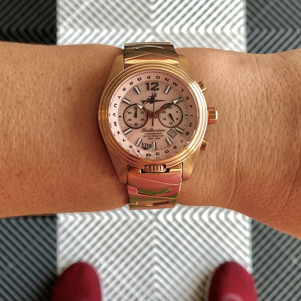 First Class all the way. Rose Gold Mother-of-Pearl dial complete this beautiful classy watch. Features include patent-pending ALPHABezel to assist in remembering ATIS when you fly or anything you can use a letter for (One of our Crew Members said she is going to use it to remember the name of people she meets for the first time – clever!). Just rotate the alphabet letter to the magnifying window at 6:30. EZ Squeeze pins on the back of the band allow you to easily remove or put on any 20mm strap. No need to use any tools or take it to a jeweler to swap out your band.