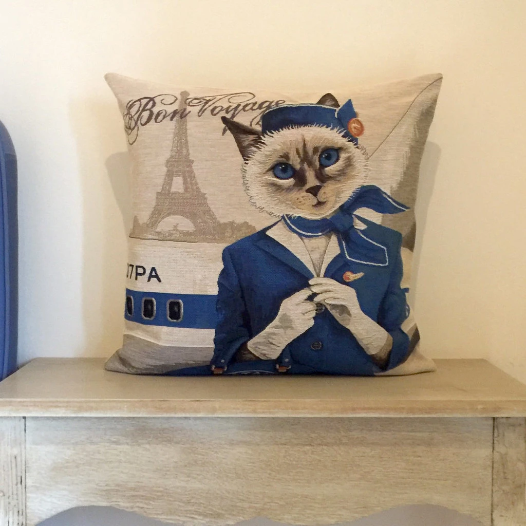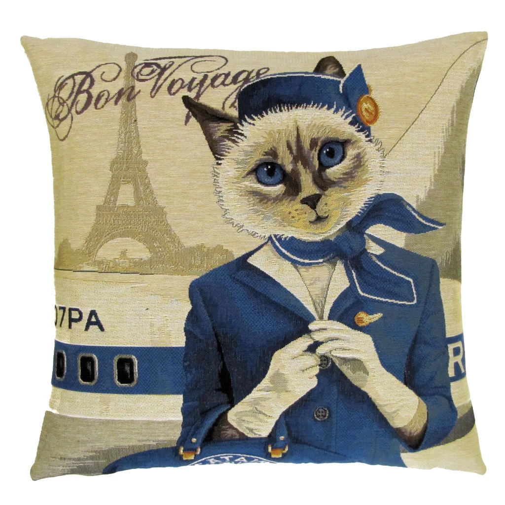 This tapestry cushion is part of a line of three cushions showing two flight attendants cats and a pilot. It is woven on a jacquard loom. Tapestry design is a craft that only a few master. The designer starts from a high resolution image, which he scans and then completely reworks it until it is ready for weaving. On average, the “cleaning up” of an image takes between 12 and 16 hours.