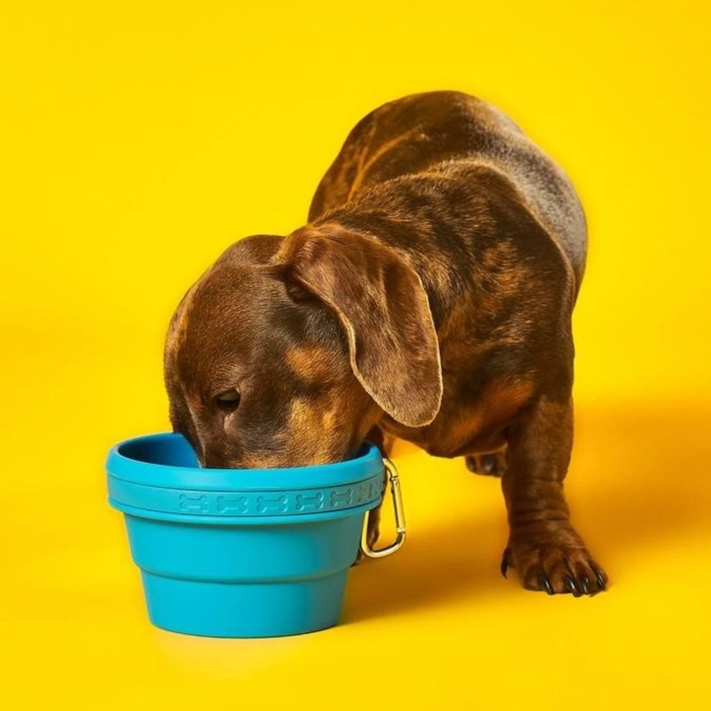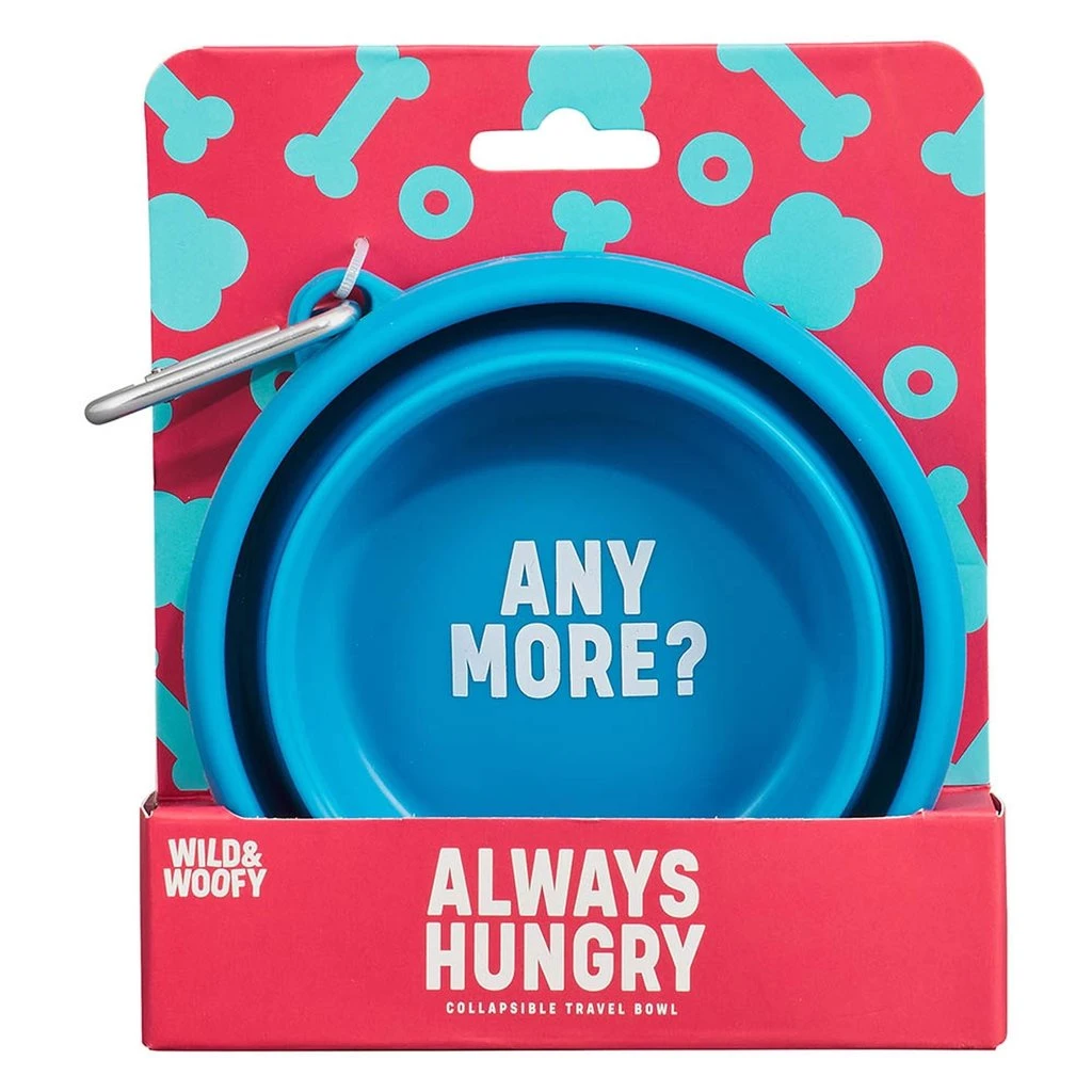 Made from strong, durable blue coloured rubber; it features quirky words ‘Any More?’ and folds into itself for easy storage when not in use. Suitable for food or water, this portable bowl includes a handy carabiner so you can clip it on to any bag or leash.