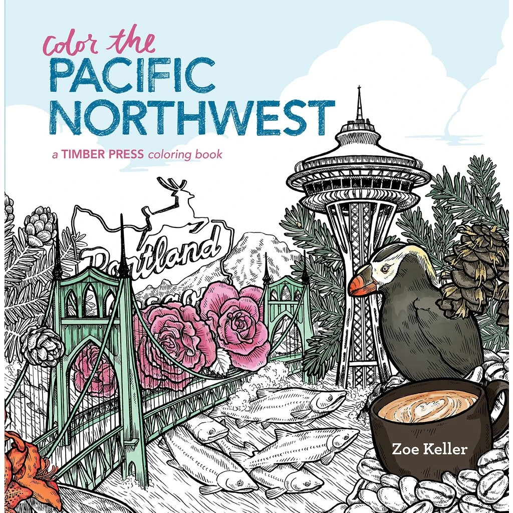 Color the Pacific Northwest is an inky exploration of the people, places, plants, and popular culture that define Oregon, Washington, and British Columbia. The 50 illustrations appear on only one side of a high-quality paper that supports a variety of mediums, including pencils and markers. You can color Sasquatch, ink your own latte art, fill in the details of an intricate family of salmon, discover the Oregon Trail, and color a flying fish from Seattle’s Pike Place Market, all from the comfort of your own home.