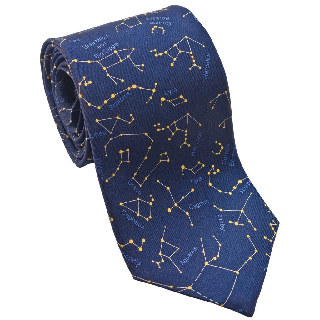 The perfect silk necktie for star gazers and night owls alike. All the constellations cleverly depicted on a night blue background