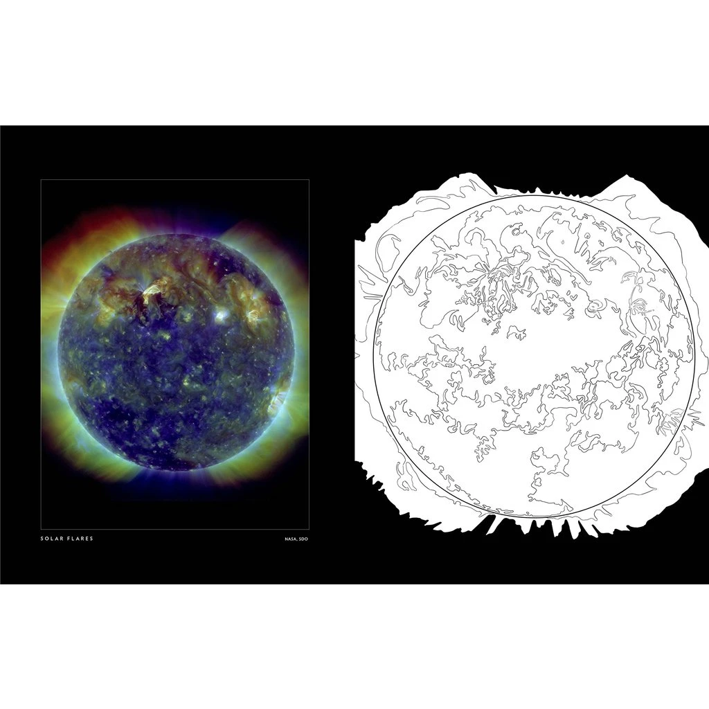 Each spread features a full-color photograph from NASA’s archives to inspire coloring on the adjacent page.