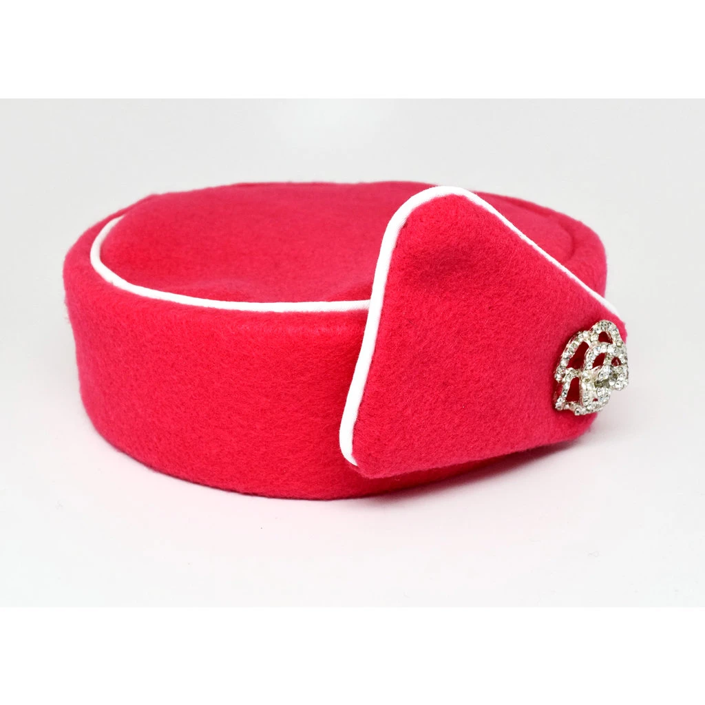 The Elite Stewardess Style Pillbox is hand-made in a solid color polyester felt with cotton or polyester cotton blend and includes a white piping to contrast the color.