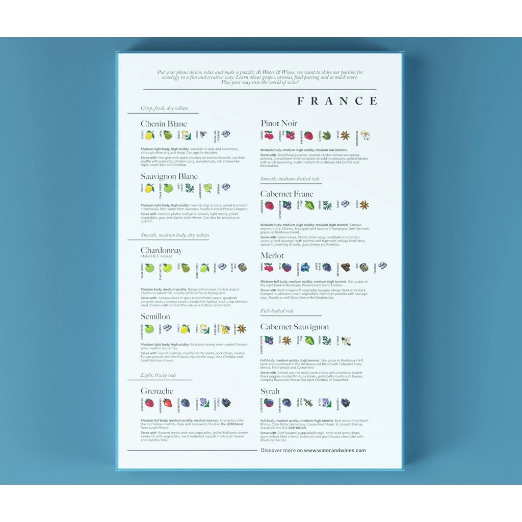 The French wine puzzle highlights the country’s key wine-producing regions, main grape varieties, and star appellations. The beautiful hand-drawn map of France was carefully curated by a very favourite sommelier and also includes grape profiles describing aromas, key characteristics, and food pairing tips! Illustrated by hand, and the team attentively reviewed every detail with the help of some of the top sommeliers in the world.