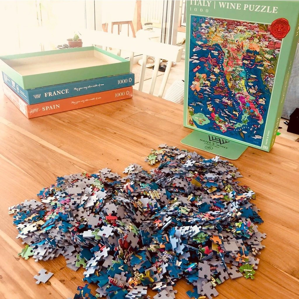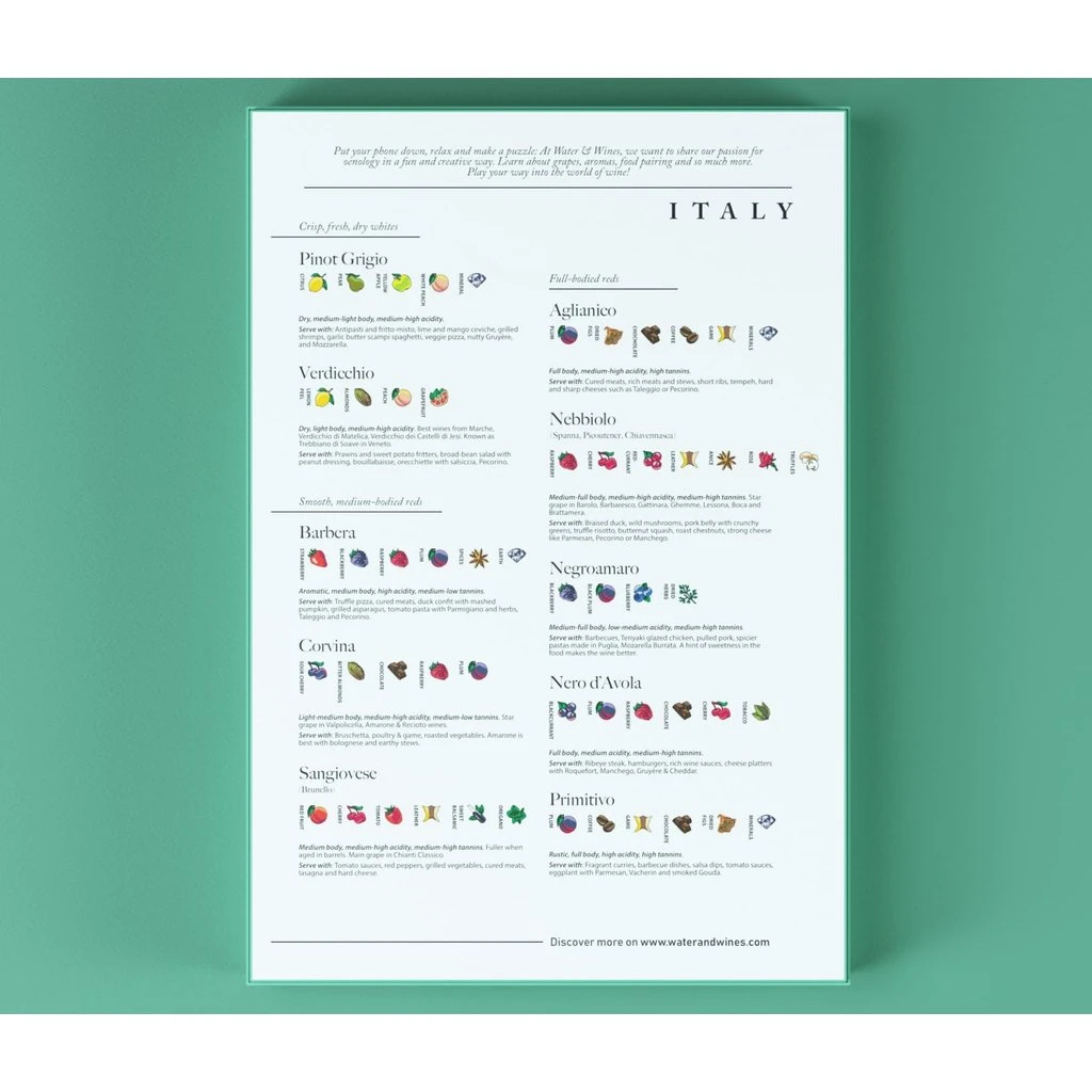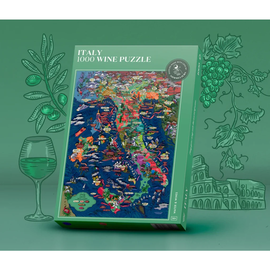 Carefully curated by a sommelier, the Italian Wine Puzzle highlights the country’s key wine-producing regions, main grape varieties, and star appellations. The box also features our grape profiles, describing aromas, characteristics, and food pairing tips! Illustrated by hand, the design was first hand-drawn and then attentively reviewed with the help of some of the top sommeliers in the world.