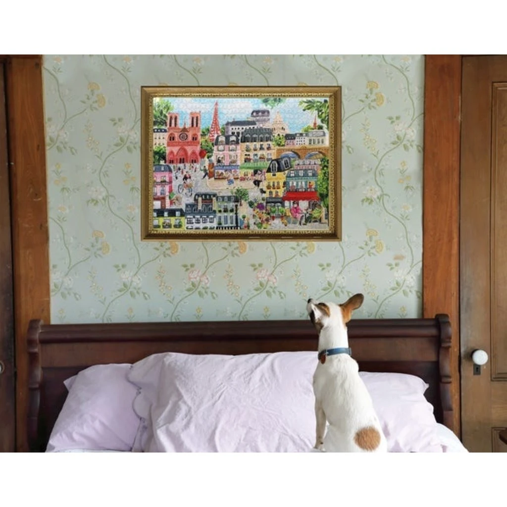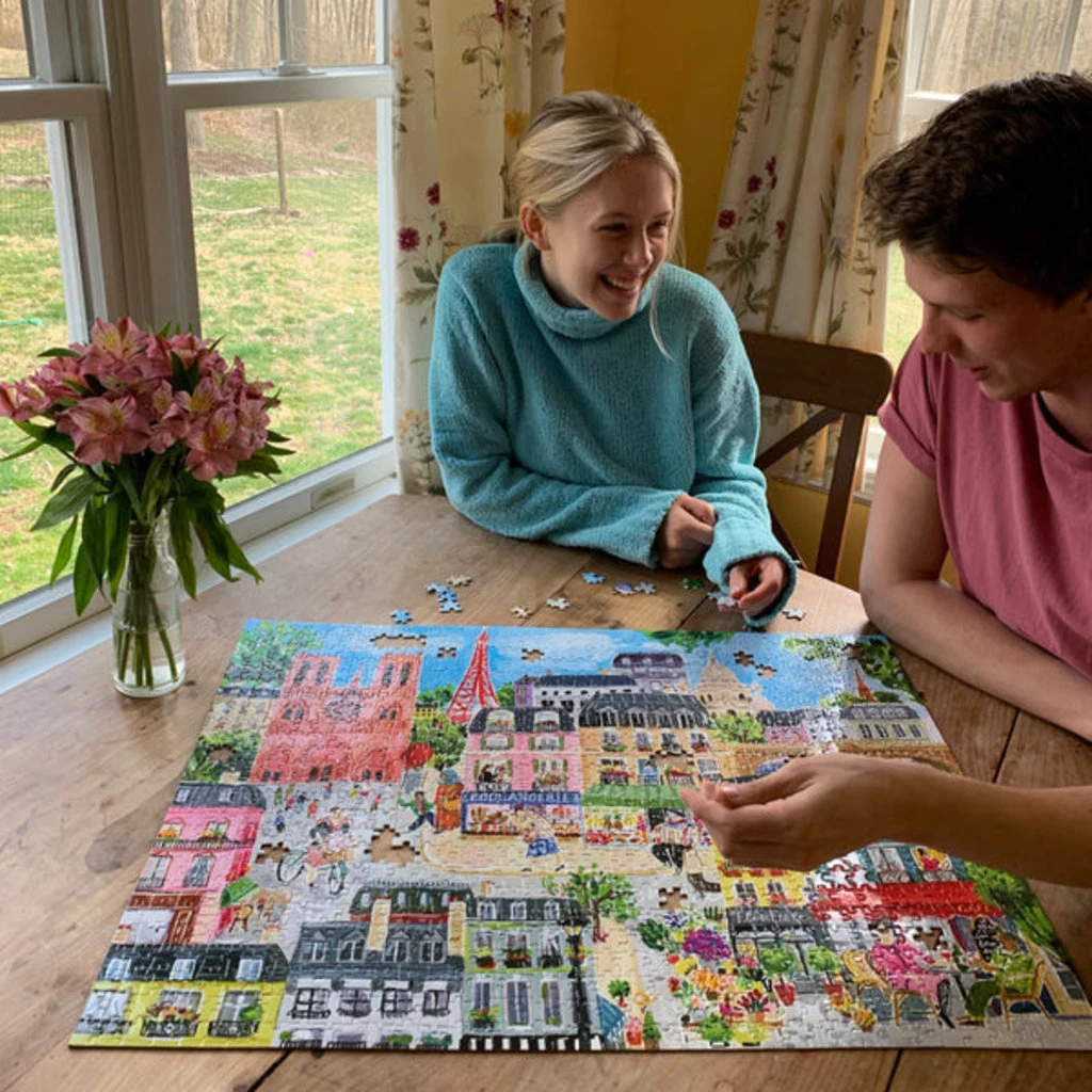 Winner of the Oppenheim Gold Award the wonderful illustration by Jennifer Orkin Lewis takes you to key sites in Paris. Swing by the Eiffel Tower, Notre Dame and the Sacré-CÅ“ur. Stop by the boulangerie for a fresh baguette grabbing fruit and flowers as you pass by Parisian street life.  This rectangular jigsaw puzzle measures 28″ x 21″ when completed and is made in China. It is sure to have wishing you could book a trip to Paris.