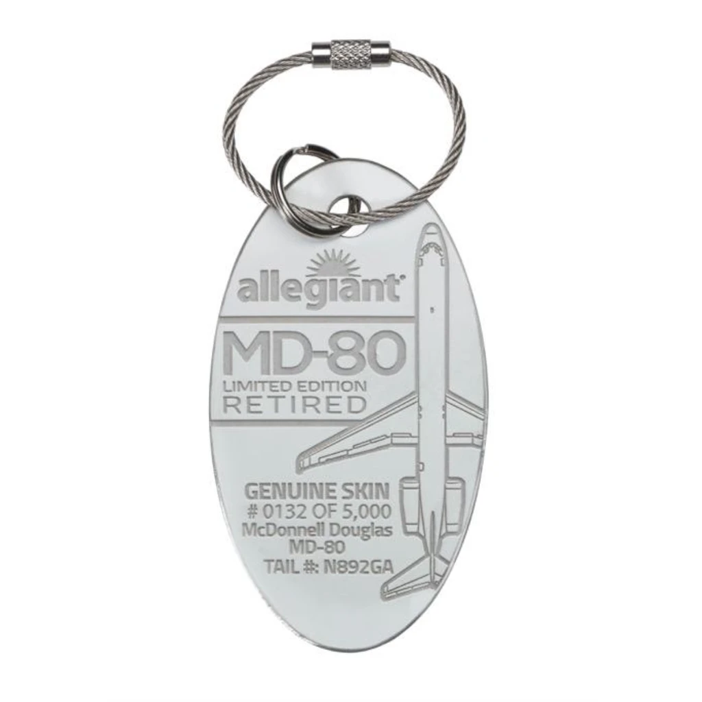 Our special edition PlaneTag is a piece of the Allegiant Air MD-80 Tail #N892GA. Affectionately called the โMad Dogโ, the MD-80 has been critical piece of the carrierโs success since it started service 1999. Allegiantโs innovative business model, of which the MD-80 fleet played an important part, has helped take more than 80 million passengers to their destinations across the country. In commemoration of Allegiantโs retirement of the MD-80 as it transitions to an all-Airbus fleet, these PlaneTags we commissioned to celebrate the aircraftโs nearly 20 years of service to the airline.-Authentic – made from actual retired aircraft fuselage, not merely stamped metal.ย