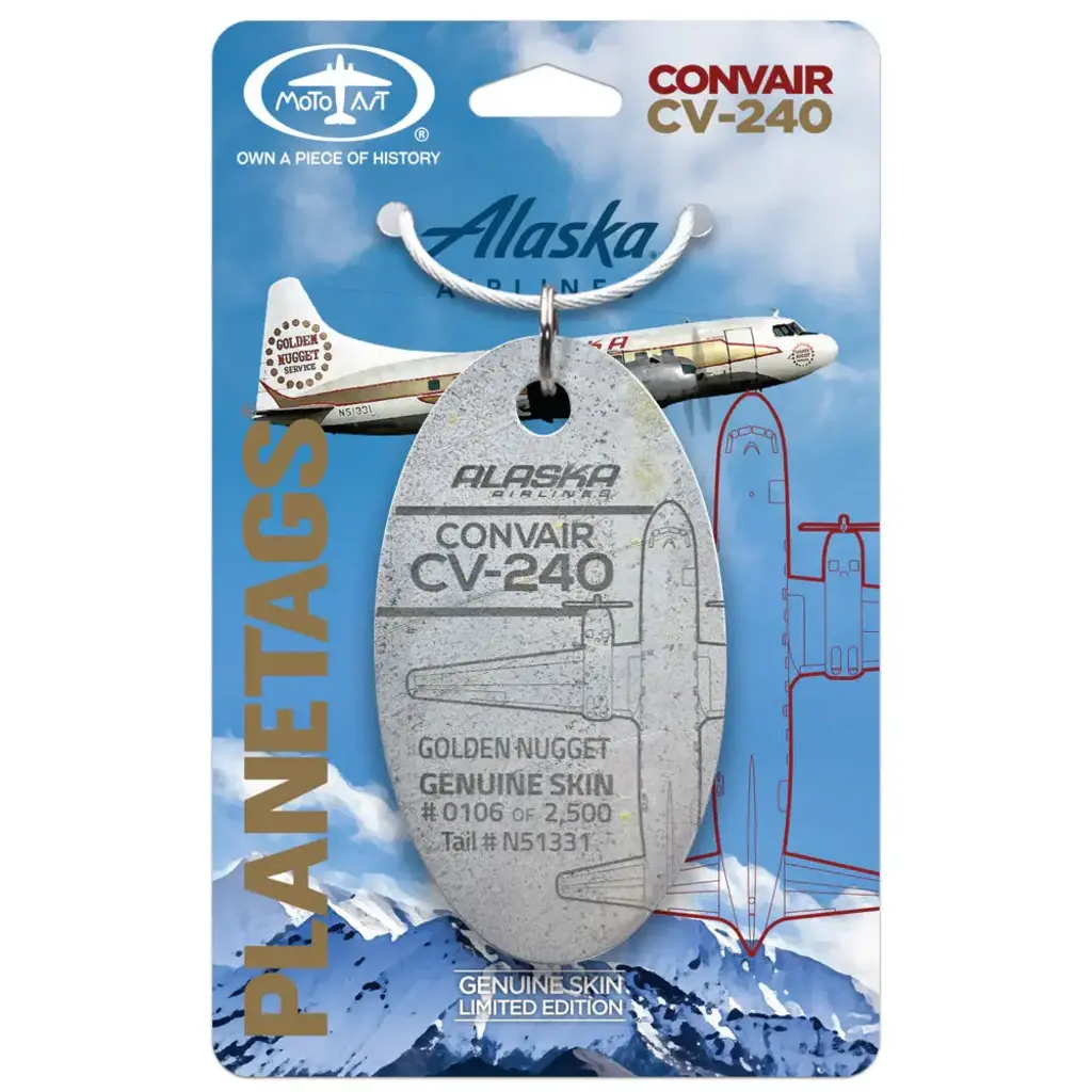 The Convair CV-240 is an iconic piece of aviation history, and MotoArt is bringing this history to life with Alaska Airlines CV-240 PlaneTags. Crafted from the skin of N51331, each Tag is a fragment of a remarkable tale.