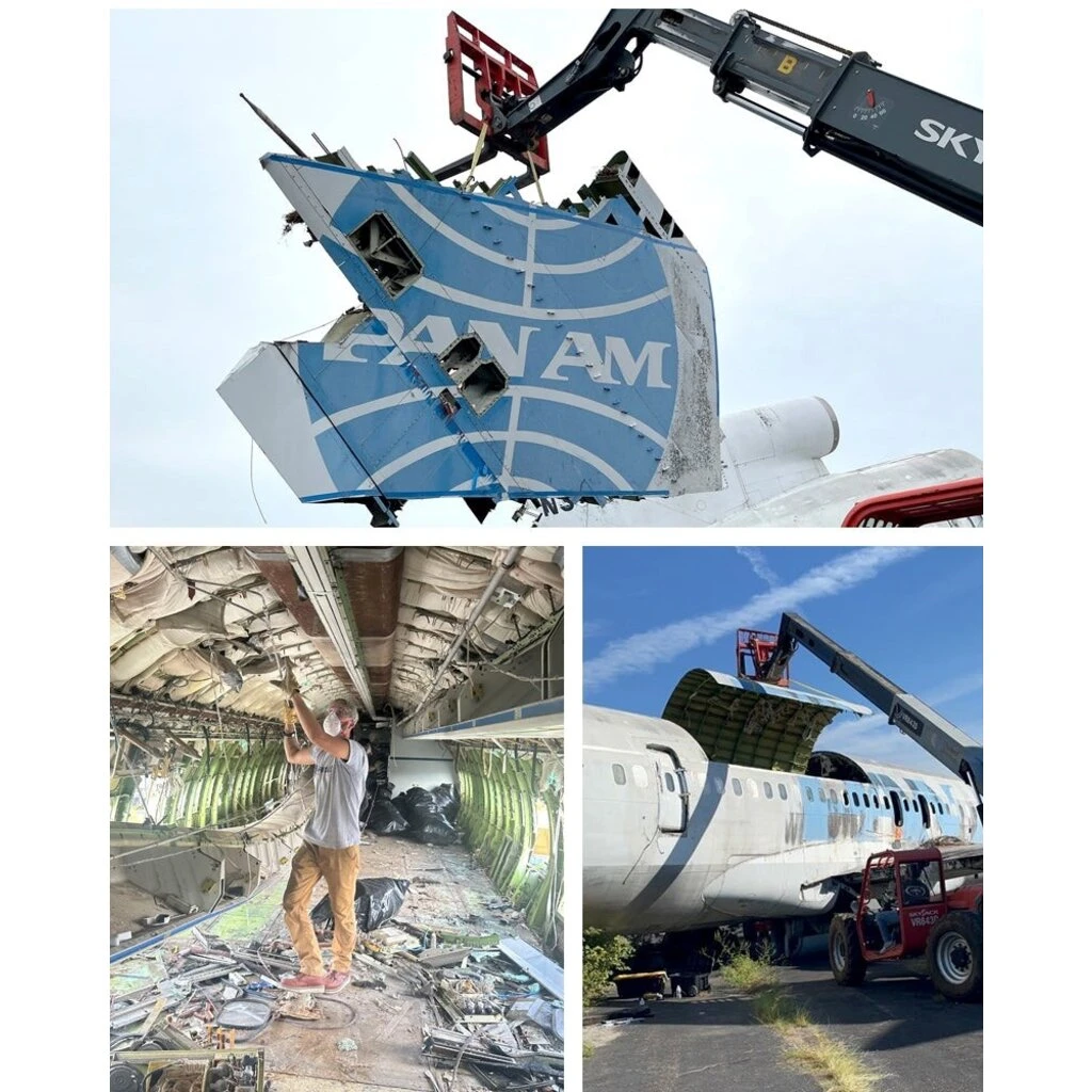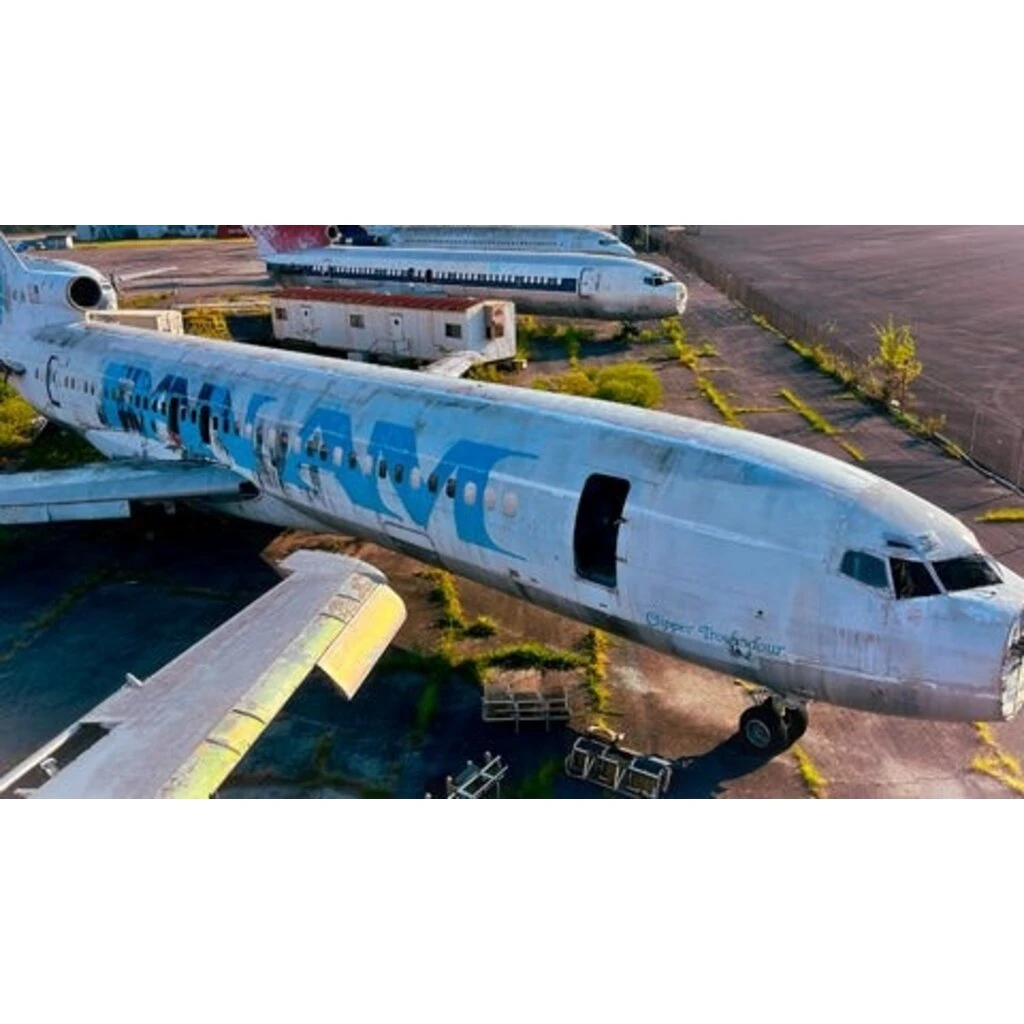 Our Boeing 727-227 took its first flight on May 12, 1970. Registered as N402BN, it flew for Braniff International Airways, followed by Northwest Airlines as N206US. On March 14, 1988, it was delivered to Pan Am as N385PA and flew with the airline until 1991. It remained in boneyard storage, still in its Pan Am colors, until 2023.