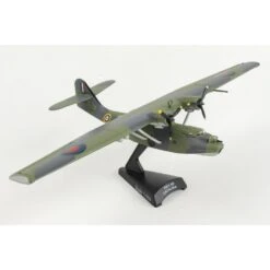 Produced by Consolidated Aircraft, the PBY Catalina was a flying boat which later became an amphibious aircraft, used by several countries in the 1930’s and 1940’s. It is a long range aircraft, which did not require a runway to operate, as it was capable of both take-off and landing on the water. The PBY’s uses included maritime patrol, bombing, anti-submarine warfare, and search and rescue missions. Remembered for their role in rescuing downed airmen, the PBY saved thousands of lives. Catalina airmen referred to their aircraft as the “Cat” on combat missions and “Dumbo” during air-sea rescue. The name Black Cats refers to a select group of squadrons whose mission it was to strike at night. Painting their aircraft matte black, installing special radar and flame dampers over the exhaust ports, and often using only the lights on their instrument gauges to guide them, these squadrons were virtually undetectable at night. This Die-cast metal airplane model comes in 1:150 scale with plastic stand and is approximately 5 1/8 inches long with 8 1/4 inch wingspan.