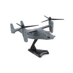 The Bell Boeing V-22 Osprey is a multi-mission military tilt-rotor aircraft, with both a vertical takeoff and landing and short takeoff and landing capabilities. The aircraft was designed to meet the needs of the Defense Department’s four U.S. armed services. The V-22 takes off and lands like a helicopter, but once airborne its engine can be rotated to convert the aircraft to a turboprop airplane, capable of high-speed and high-altitude flight. This die-cast metal model comes in 1:150 scale with plastic stand and is approximately 4 5/8 inches long with 3 3/4 inch wingspread, 2 1/2 rotor diameter (each). Model can be displayed in cruise mode , VTOL mode or in transition. Total model width is 6 inches.