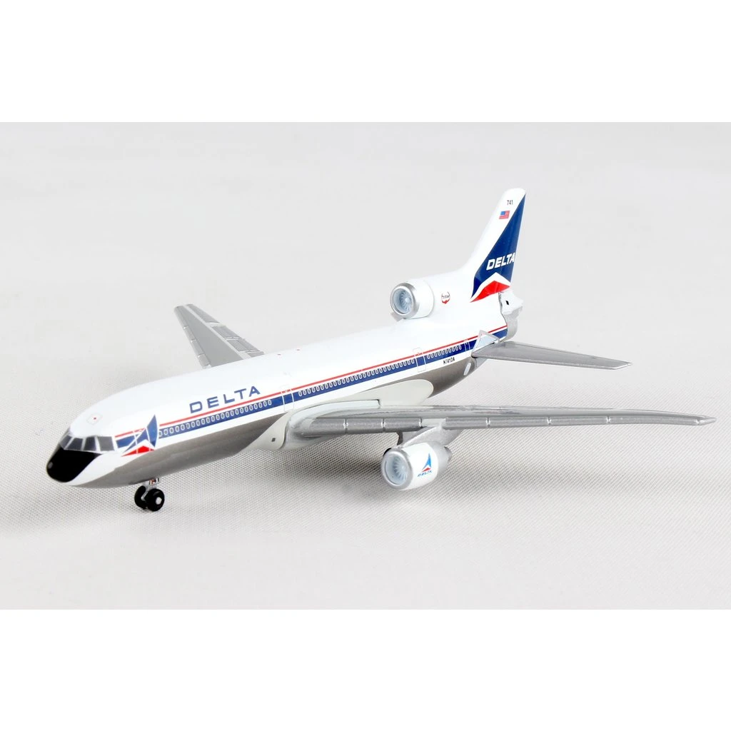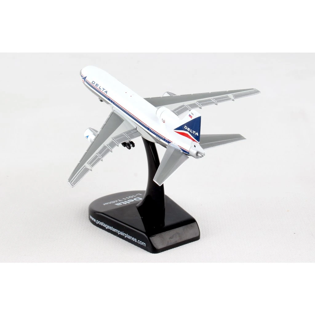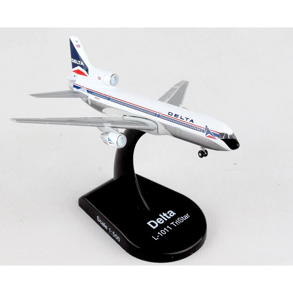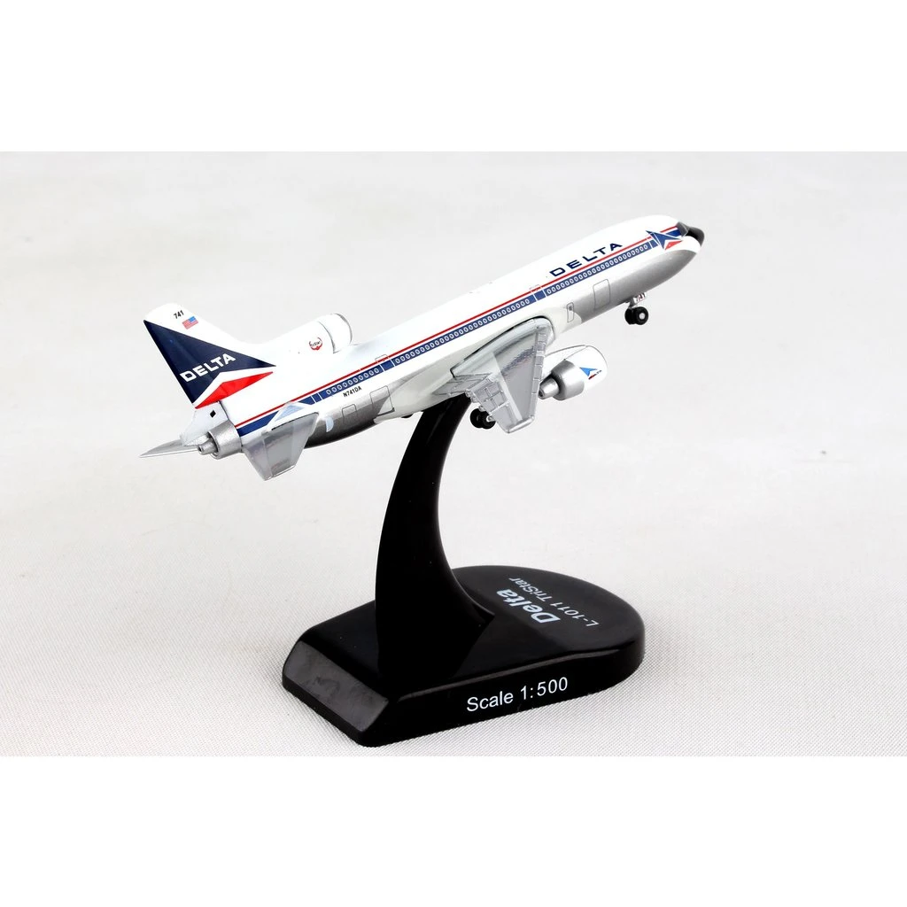 This Delta Air Lines L-1011 Tristar Die-cast metal airplane model comes in 1:500 scale with plastic stand and is approximately 4 inches long with 4 inch wingspan.Â