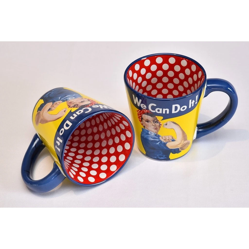 The inside of these coffee mugs are red and white polka dot – just like the scarf Rosie wears! Both sides of the mug have the famous poster of Rosie saying, “We Can Do It!”