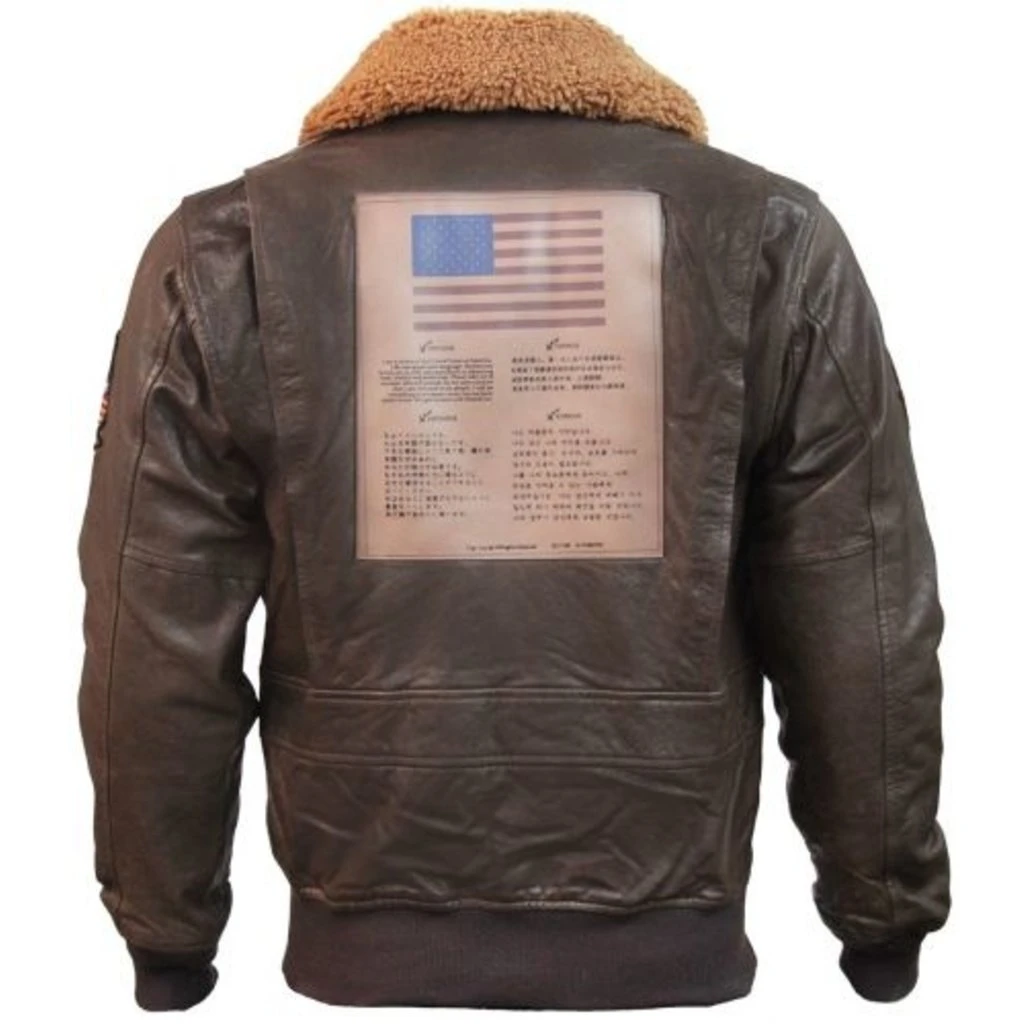 This jacket is made of 100% super vintage washed goat skin leather with a bi-swing back and removable real shearling mouton fur collar. It features wool-nylon blend knit cuffs and waistband, top and side entry front pockets, full zip front over a wind flap, underarm grommets for ventilation, two inside chest pockets, squadron patches, naval aviator blood chit and European escape map lining.