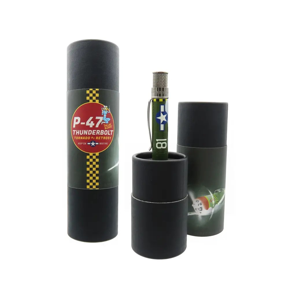 The P-47 Thunderbolt is now taking off to fly alongside the P-51 and Corsair in the Vintage Metalsmith series. This warbird pen is designed after the most popular World War II U.S. fighter plane with over 15,000 units produced. It was known for its heavy artillery that successfully served in offensive air-to-air combat plus skillful ground attack. Its rugged construction allowed it to withstand battle damage and still remain airworthy. The Tornado emulates the P-47 with its acid-etched rivets and paneling on the barrel and painted with the striking red, yellow and green color scheme. It’s emblazoned with the nose art of the 352nd Fighter Group’s P-47 nicknamed “Dallas Blonde,” and complete with antique silver trim and matching checkered finial. Pick up this beaut and prepare for your next mission.