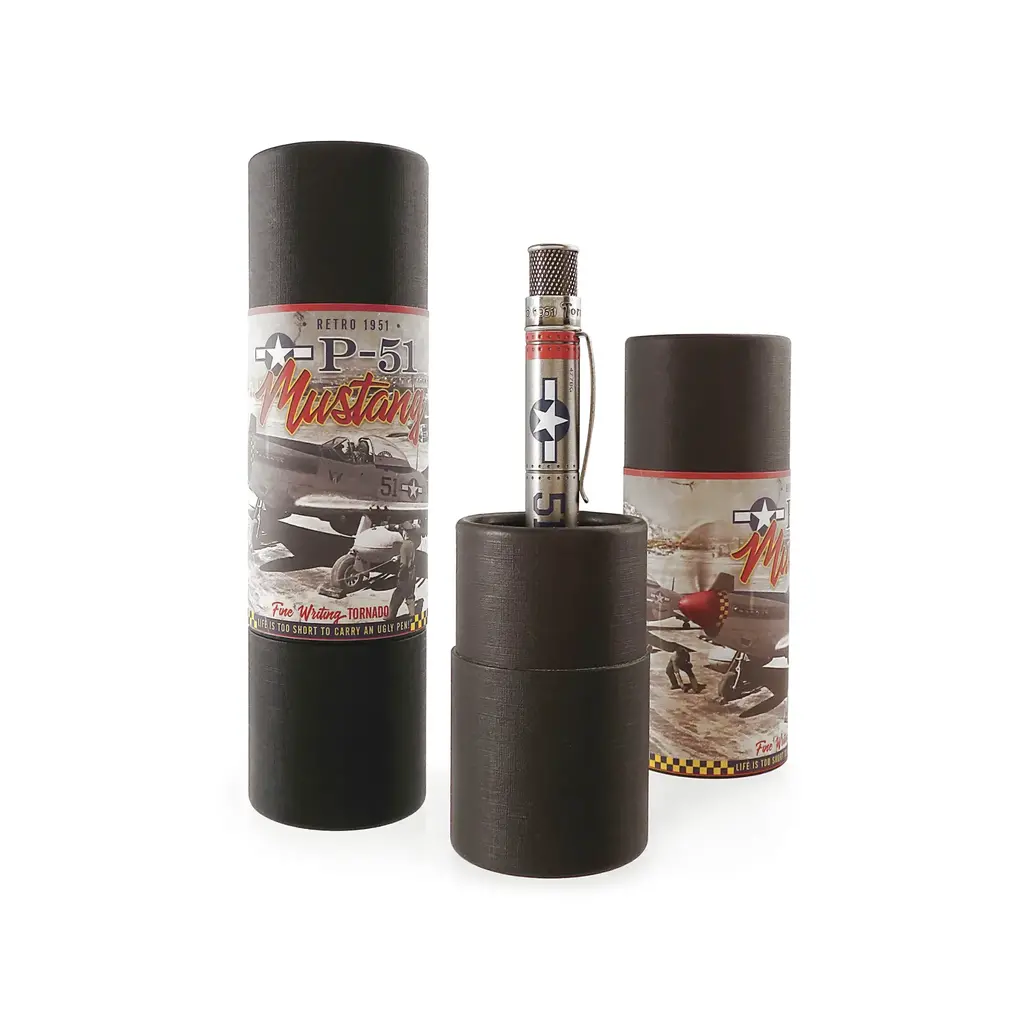 The P-51 Mustang was an American long-range fighter that flew in World War II and the Korean War. They were best known for being flown by the Tuskegee Airmen that were the first African-American military squadron in the United States Armed Forces. They were nicknamed “Red Tails” from the red markings that decorated their planes and inspired the design of this Tornado rollerball pen. The barrel has also been acid-etched with rivets and the exhaust pipes with a stonewash pewter finish for an aged look. Pick up the P-51 Mustang for your collection or as a gift for any flight or history enthusiast.