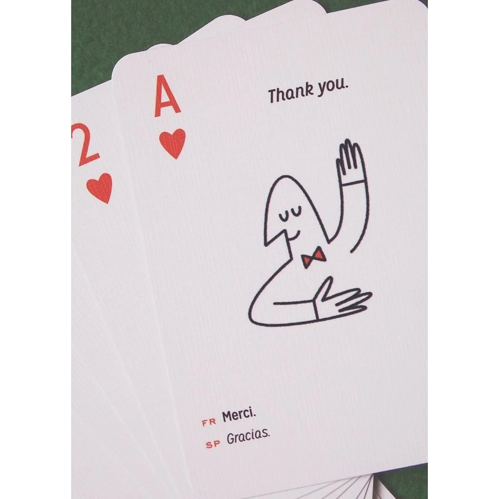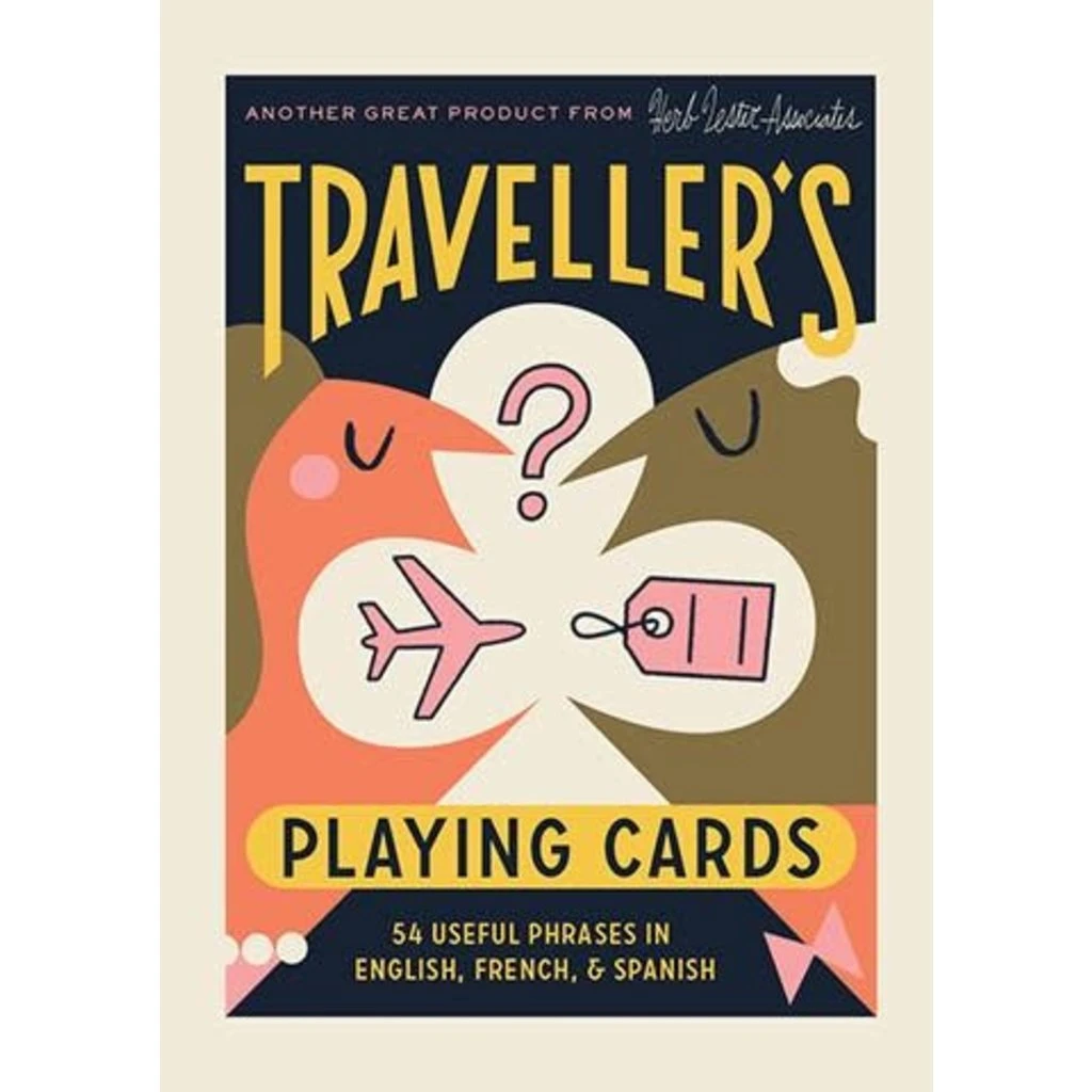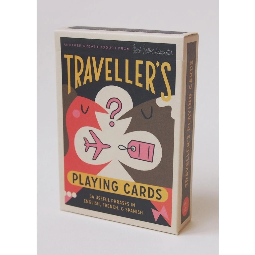 This deck is suitable for any of the traditional uses – games, tricks, a solo round of patience – but each of the 54 cards (four complete suits and two jokers) also doubles as your own personal translator, with a commonly used phrase along with its French and Spa-nish equivalent.